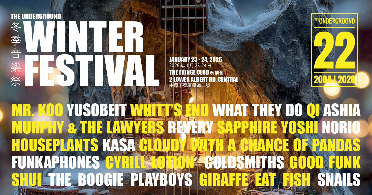The Underground kicks off its landmark 22nd anniversary year with a bang at the Winter Festival on 23 & 24 January 2026 – the ideal launchpad for Hong Kong's longest-running original live music promoter's storied legacy of 500+ gigs, 290+ shows, 800+ bands spotlighted, and non-stop scene-building since Chris B founded it in 2004, leading to the main June celebration.